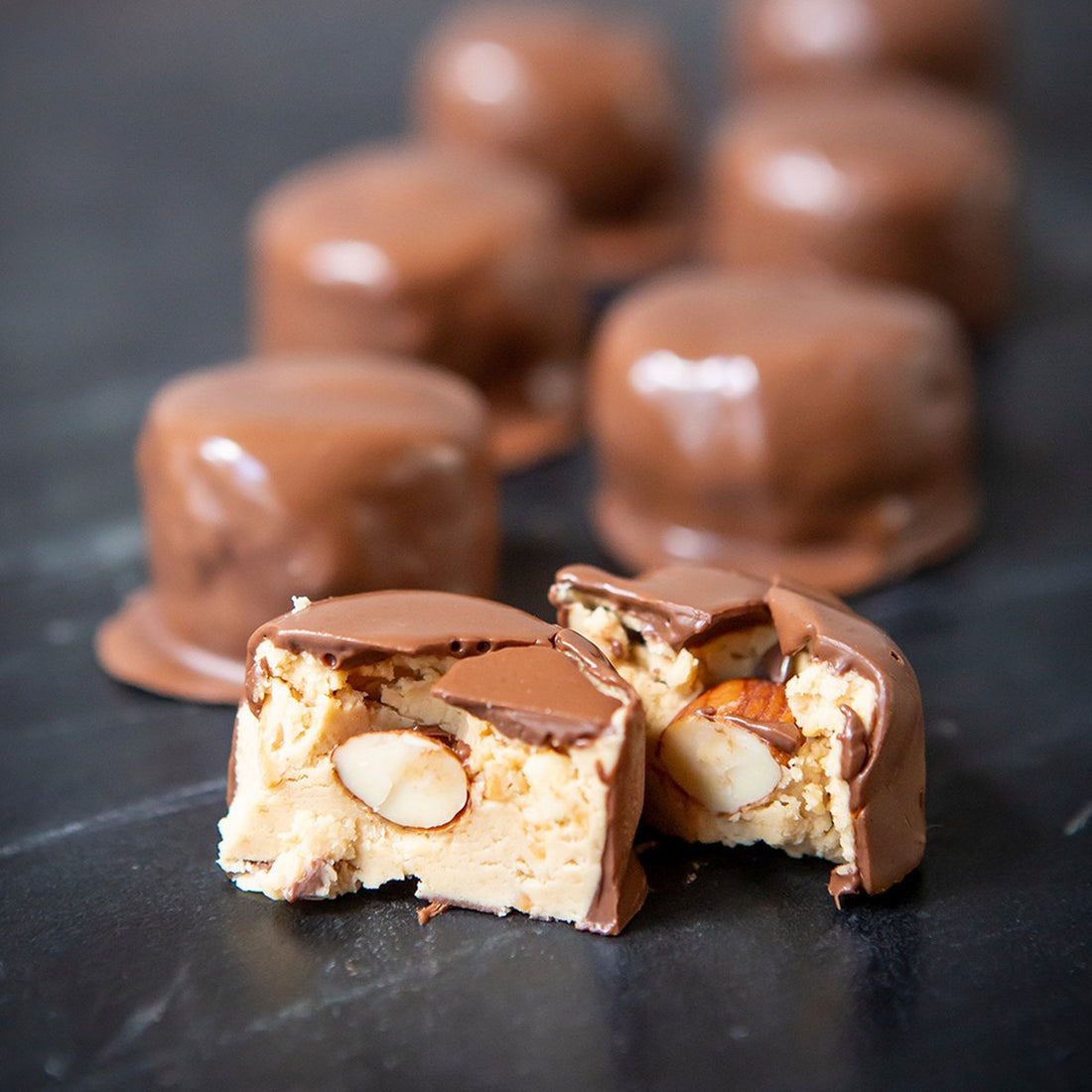 Colts Bolts are a beloved Nashville treat, and these Bolts Bites feature all the goodness of traditional Bolts in bite-sized balls. Inside, you’ll taste creamy peanut butter whipped to a mousse-like texture. Milk chocolate enrobes each bolt, which are topped with whole roasted almonds.